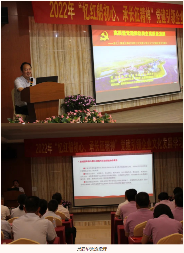 接著,湖北省委講師團(tuán)基層理論宣講員張啟華教授以“高質(zhì)量黨建推動(dòng)企業(yè)高質(zhì)量發(fā)展”為主題進(jìn)行授課。張教授從“苦難與輝煌”、“消失與崛起”、“巨變與挑戰(zhàn)”、“經(jīng)驗(yàn)與啟示”、“輝煌與蝶變”五個(gè)方面分別講述了中國共產(chǎn)黨的百年奮斗史、跌宕起伏中國房企十年之變、房企掌舵者眼中的2022年、紐約灣區(qū)發(fā)展成為世界級(jí)灣區(qū)的原因以及高科技贏在新時(shí)代的內(nèi)容,并在講解中融入了湖北大集建設(shè)集團(tuán)和武漢閱景匯兩家公司的發(fā)展歷程,讓大家對(duì)中國共產(chǎn)黨的發(fā)展、公司的發(fā)展以及個(gè)人的發(fā)展有了更加清晰的認(rèn)識(shí)以及深刻的反思。