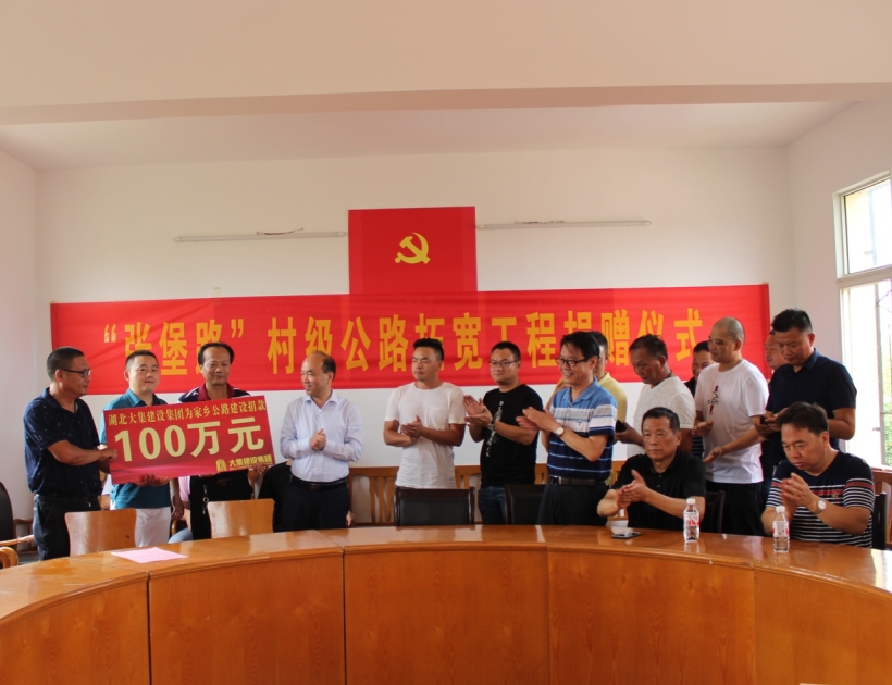 情系家鄉(xiāng)發(fā)展,勇?lián)鐣熑巍?月26日,集團董事長徐濤、總經(jīng)理徐遠征、副總經(jīng)理徐家富及各項目經(jīng)理來到蔡甸區(qū)大集街堡家咀村村委會,為“張堡路”村級公路拓寬工程進行捐贈,集團董事長徐濤代表湖北大集建設(shè)集團為該工程捐款一百萬元。